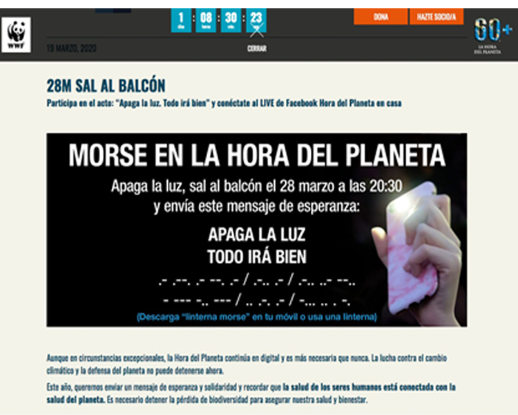 Por eso, mañana sábado 28 de marzo, de 20:30 a 21:30 horas, la organización ecologista propone apagar las luces del domicilio, como siempre, y además lanzar un mensaje en defensa del planeta, la casa que todos compartimos. WWF propone lanzar un mensaje de esperanza al mundo utilizando la linterna del móvil (o una linterna tradicional) y escribir en lenguaje morse: “Apaga la luz. Todo irá bien”.