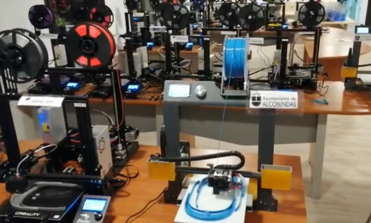 Las impresoras 3D de la Universidad Popular Miguel Delibes de Alcobendas fabricando viseras protectoras