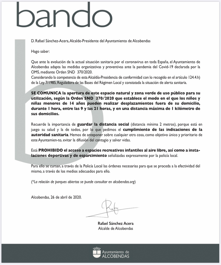 El Alcalde de Alcobendas, Rafael Sánchez Acera emite un bando para comunicar la apertura de 31 parques y zonas verdes