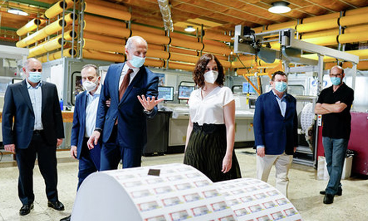 La presidenta madrileña ha recorrido las instalaciones de este centro, ubicado en el polígono industrial de Vallecas y donde trabajan 100 personas. Debido al coronavirus, la impresión de los cupones quedó suspendida por primera vez en sus casi 82 años de historia.