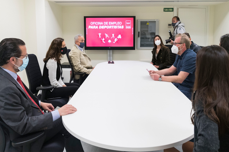 La consejera de Presidencia, Eugenia Carballedo, y el consejero de Hacienda y Función Pública, Javier Fernández-Lasquetty, acompañados por el presidente del Comité Olímpico Español, Alejandro Blanco, han visitado hoy la Oficina de Empleo de Goya, donde han podido conocer el proyecto y escuchar las necesidades de deportistas en activo como Fernando Carro, actual plusmarquista español de 3.000 metros obstáculos; Damián Quintero, número uno del Ranking Olímpico para Tokio 2021 de karate; Sandra Aguilar, gimnasta rítmica española con más medallas internacionales oficiales; y Azucena Díaz, corredora de fondo.