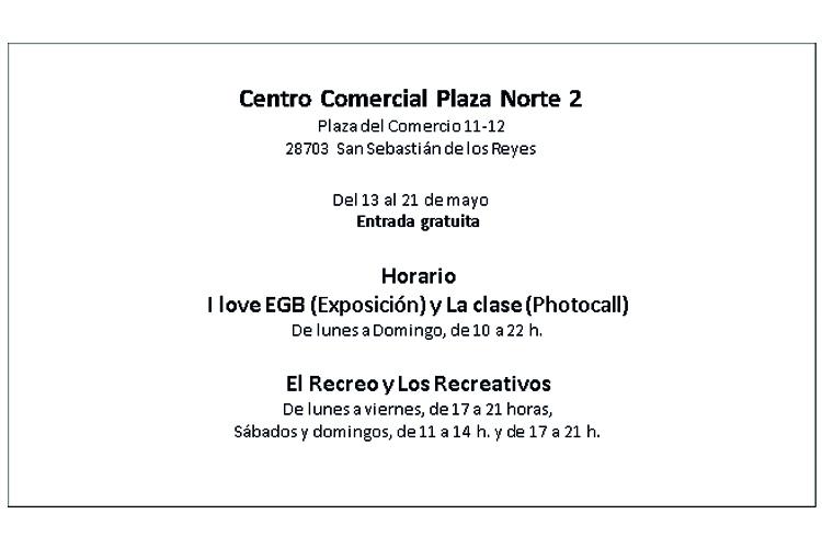 Mañana Viernes, 13 de mayo, el Centro Comercial Plaza Norte 2 inaugurará “Back to EGB”, todo un homenaje a la infancia de los años 70 y 80. La iniciativa propone un divertido viaje en el tiempo a través de las anécdotas, los objetos, las expresiones, e incluso las imágenes y el sonido de una época inolvidable para toda una generación.