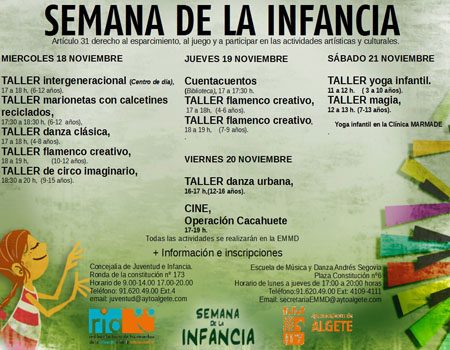 - El Ayuntamiento de Algete, a través de la Concejalía de Infancia y la Escuela Municipal de Música y Danza, celebra del 16 al 21 de Noviembre la Semana de la Infancia con un programa con más de 30 actividades formativas y lúdicas dirigidas a niños y niñas desde los 6 meses hasta los 16 años.