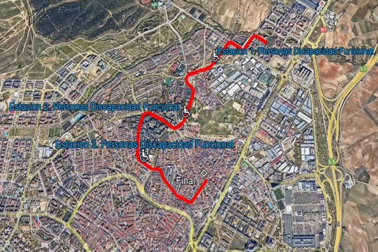 Av. de Quiñones, glorieta de la Av. Tenerife con Av. de la Dehesa y Av.de la Dehesa hasta C/ Emilia Pardo Bazán, Av. Tenerife, Plaza de los abogados de Atocha, Av. Navarrondán, Av. Murcia, Plaza de Andrés Caballero, Av. Baunatal, plaza de la Universidad Popular, Av. Independencia, Guadarrama, C/ Asturias, Av. Colmenar Viejo,C/ Real.