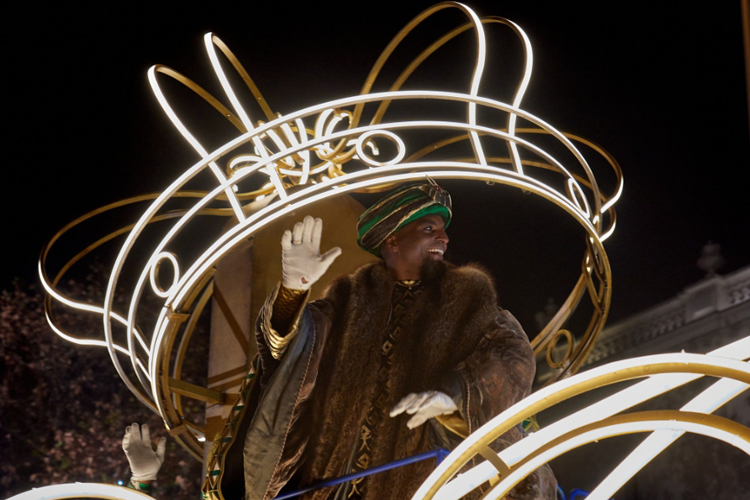 Una gran caravana llegada desde África anuncia la presencia de la carroza del rey Baltasar. Sobre un elefante que descansa del largo camino recorrido, pasea por las calles de Madrid antes devisitar las casas para dejar regalos a los niños. Elrepresentante de la juventud del hombre porta la mirra, una sustancia aromática con propiedades medicinales que simboliza la curación del dolor y representa la dualidad de Jesús como ser divino y humano a la vez.