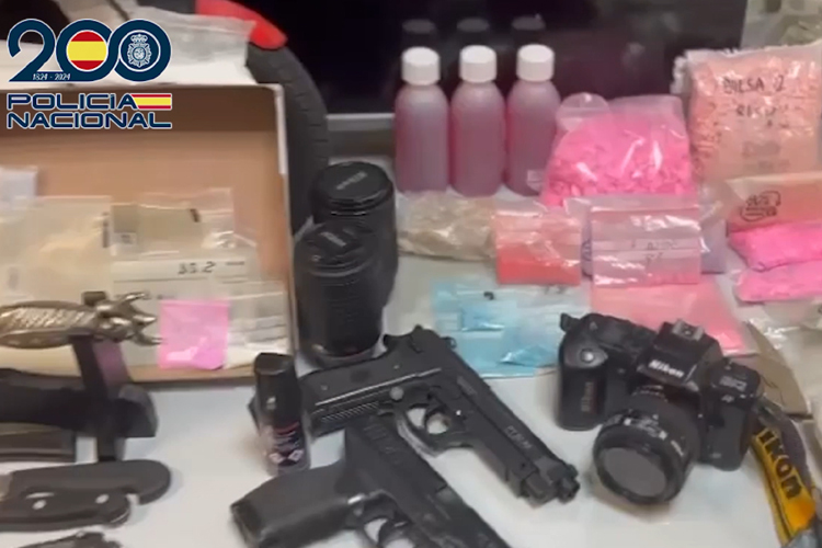 Se practicó una entrada y registro donde se intervinieron diferentes tipos de sustancias estupefacientes, tales como hachís, marihuana, MDMA, cristal, speed, ketamina, cocaína y LSD, así como diversos útiles y sustancias para su elaboración, dos armas de fuego simuladas, armas blancas y más de 5.000 euros en efectivo.