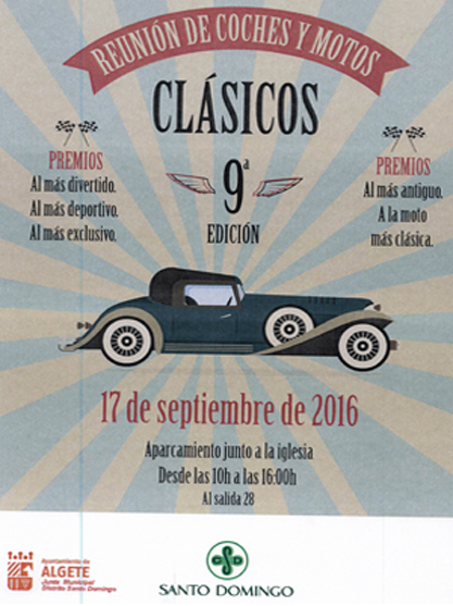 El próximo sábado 17 de septiembre, desde las 10 h hasta las 16 h, se celebrará en Algete otra reunión de coches y motos clásicas, concretamente será la 9ª edición, y el lugar para poder disfrutar del espectáculo que suponen estos coches y motos, será el Centro Comercial Santo Domingo, en la avenida de Guadalix, 35-37, en la salida 28 de la A-1 (R.A.C.E. Urbanizaciones).
