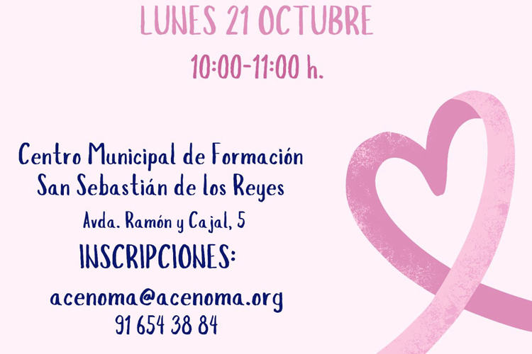 Con motivo de la conmemoración, el próximo 19 de octubre, del Día Mundial contra el Cáncer de Mama, el Ayuntamiento de San Sebastián de los Reyes y ACENOMA (Asociación Empresarial del Norte de Madrid) han organizado la charla: “Cáncer de mama y los hábitos saludables para su prevención”, impartida por GEICAM. Esta asociación científica apuesta por el ejercicio físico y la investigación como grandes aliados para lograr un futuro sin temor al cáncer de mama.