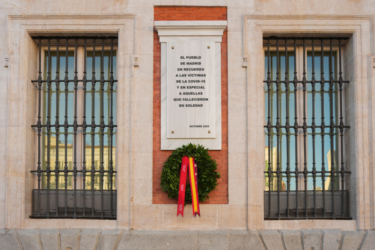 En ella se puede leer “El pueblo de Madrid en recuerdo a las víctimas del COVID19 y en especial a aquellas que fallecieron en soledad” y la corona depositada hoy luce con cintas de las banderas de España, la Comunidad de Madrid y la ciudad de Madrid. Esta placa se colocó hace ahora cuatro años en la sede de la Presidencia regional y se suma a las dos que, en el mismo lugar, recuerdan desde la emblemática Puerta del Sol los acontecimientos del 2 de mayo de 1808 y los atentados terroristas del 11 de marzo de 2004.