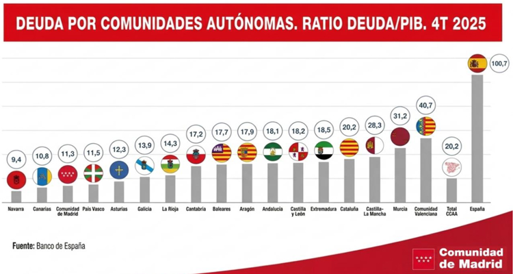 La Comunidad de Madrid ha reducido medio punto su deuda en el último año y ha registrado la más baja en relación al Producto Interior Bruto (PIB) de todas las regiones del país sin un régimen especial. Según los datos publicados hoy por el Banco de España correspondientes al cuarto trimestre de 2025, Madrid cuenta con un endeudamiento del 11,3% del PIB, 8,9 puntos por debajo de la media nacional, que se sitúa en el 20,2%. En comparación con el tercer trimestre del año pasado, la reducción ha sido de dos décimas.